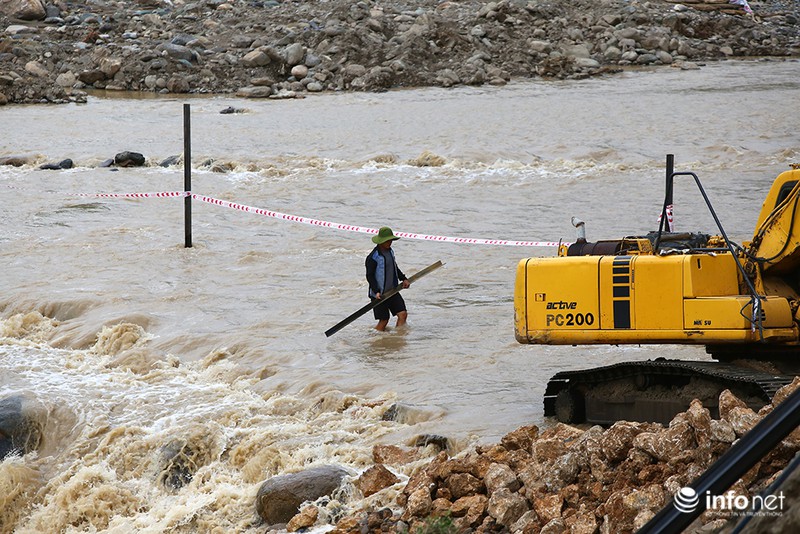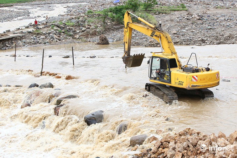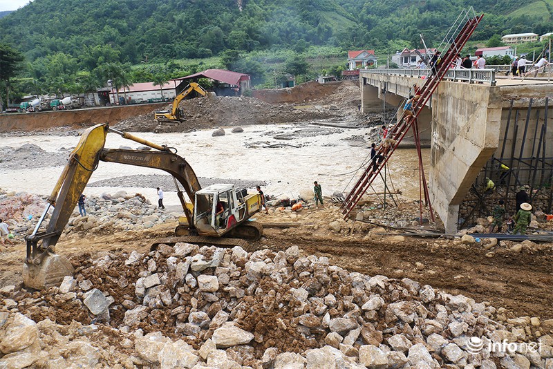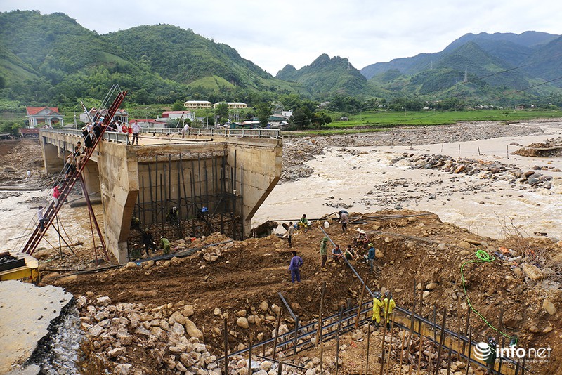 Cầu tạm khác đang được xây dựng để nối 2 đầu cầu Nậm Păm phục vụ cho công tác vận chuyển vật tư nhu yếu phẩm cho công tác cứu hộ, đặc biệt tại xã Nậm Păm. |