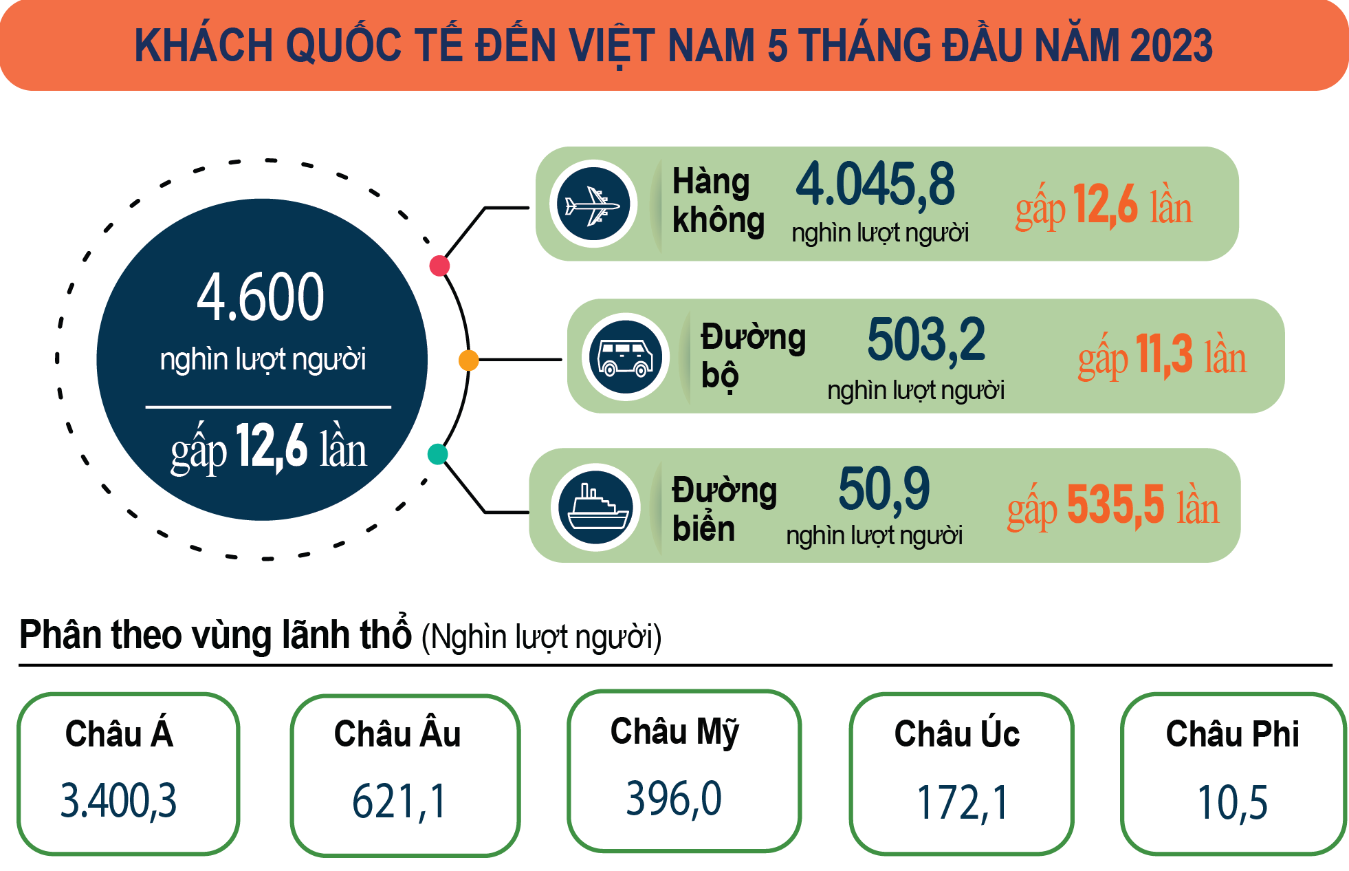 Theo dữ liệu Báo cáo tình hình kinh tế - xã hội tháng 5 và 5 tháng đầu năm 2023 được Tổng cục Thống kê công bố ngày 29/5, trong 5 tháng đầu năm 2023, lượng khách quốc tế đến Việt Nam đạt gần 4,6 triệu lượt, gấp gần 13 lần so với cùng kỳ năm 2022 và bằng khoảng 63% so với cùng kỳ năm 2019. Trong số đó, lượng khách đến Việt Nam chủ yếu theo đường hàng không, với hơn 4,045 triệu lượt, gấp 12,6 lần so với cùng kỳ.