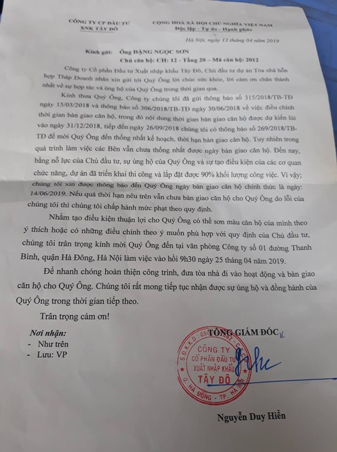 Ngày 12/4/2019, một khách hàng nhận được thông báo từ chủ đầu tư về ngày bàn giao nhà chính thức và mời mọi người đến lấy ý kiến về việc điều chỉnh màu sơn căn hộ của mình. Trong thông báo ghi "ngày bàn giao căn hộ chính thức là ngày 14/6/2019", nếu quá thời hạn mà chủ đầu tư không bàn giao căn hộ được cho khách hàng thì chủ đầu tư chấp hành mức phạt theo quy định. Nội dung thông báo này cũng thể hiện rõ việc chủ đầu tư đã nhiều lần gửi thông báo lùi thời gian bàn giao căn hộ cho khách hàng, song "trong quá trình làm việc, các bên vẫn chưa thống nhất được ngày bàn giao căn hộ".