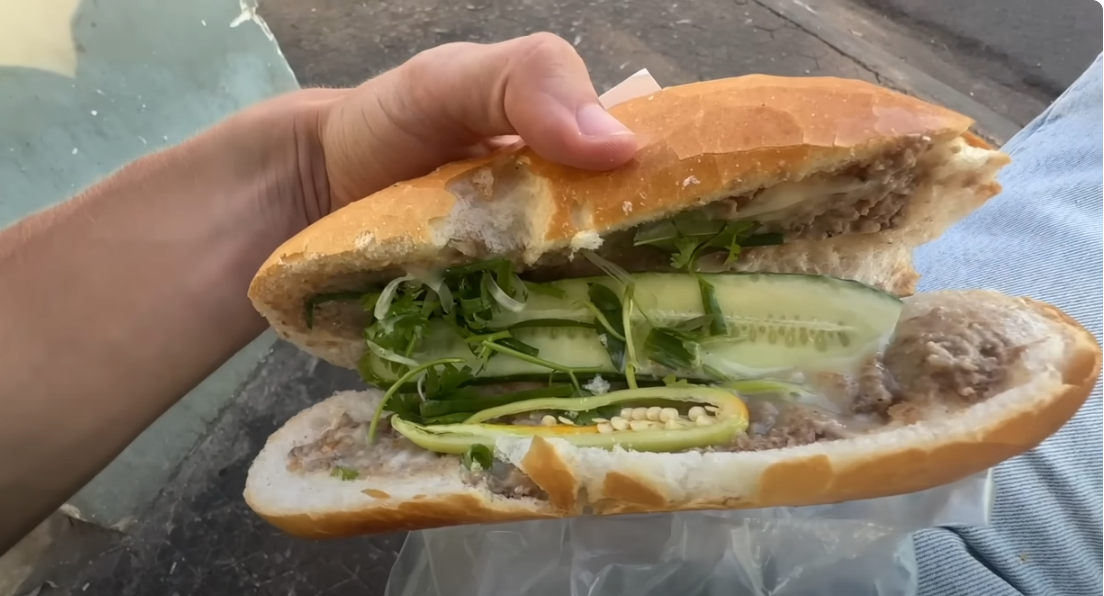 Vì muốn có trải nghiệm trọn vẹn nhất, Max không ngại di chuyển quãng đường khá xa tới quận Tân Bình để thưởng thức món bánh mì cô Điệp nức tiếng nơi đây. Quán phục vụ khách mang đi với giá vô cùng bình dân, chỉ 7.000 đồng/chiếc, đầy đủ rau ớt.