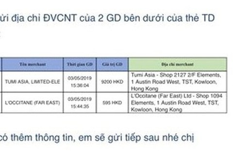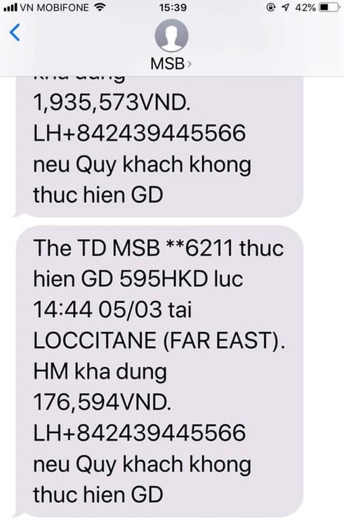 Sau khi máy bay hạ cánh xuống sân bay Hồng Kông, khi đang trong khu vực phòng chờ của sân bay, ngân hàng MSB liên tục gửi tin nhắn báo thẻ tín dụng của chị Nhữ Ngọc Diệp phát hiện có phát sinh giao dịch trong khoảng thời gian chỉ 10 phút.