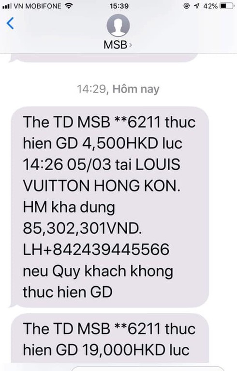 Loạt tin nhắn báo phát sinh giao dịch do ngân hàng MSB gửi về điện thoại của chủ thẻ chính. Trong đó có những giao dịch tại Louis Vuitton Hong Kong. |