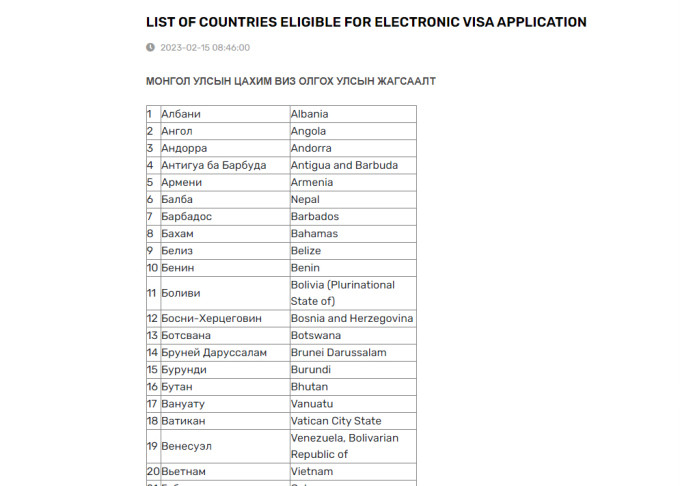 Theo danh sách được cập nhật đến ngày 15/2 trên trang web của Bộ Ngoại giao Mông Cổ, Việt Nam là một trong 98 nước có thể xin e-visa (visa điện tử).