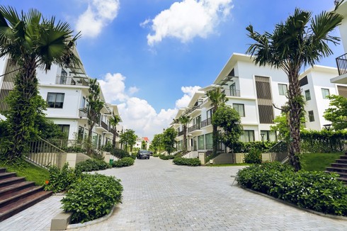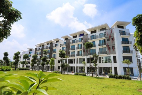Một dãy shophouse đã hoàn thiện tại Khai Sơn Town. Các trường học sẽ được xây dựng ở giữa các tòa nhà và gần kề công viên, hồ điều hòa. |