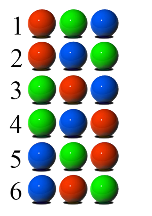 Giả sử chúng ta có 3 quả bóng màu đỏ-xanh lá cây-xanh dương. Đề bài yêu cầu: Có bao nhiêu cách sắp xếp 3 quả bóng (3 màu khác nhau) cùng một hàng?