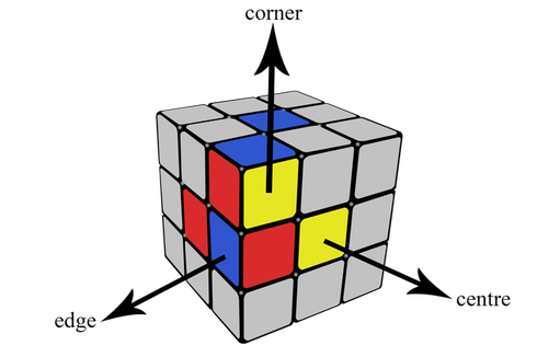 Khối lập phương Rubik có 6 cạnh và mỗi cạnh chứa 9 hình vuông. Gồm 3 phần chính là trung tâm, góc và cạnh. Có tổng cộng 6 ô trung tâm, 8 góc và 12 cạnh.
