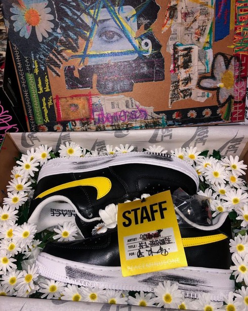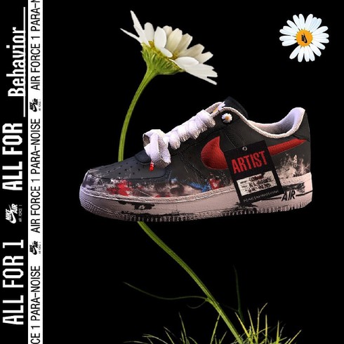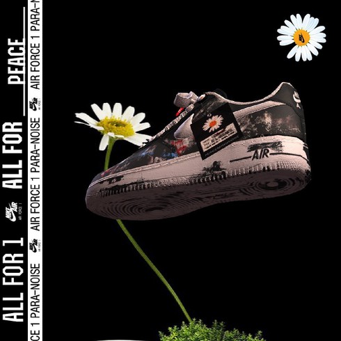 Bên cạnh ẩn ý nghệ thuật ấy thì thiết kế của đôi “Air Force 1 Para-Noise” cũng làm hài lòng đa số các bạn trẻ đam mê giày thể thao. Ngoài logo thương hiệu Swoosh của Nike nằm dọc theo thân giày như mọi lần thì nó còn có thêm biểu tượng hoa cúc nằm trên phần lưỡi gà giày, dây buộc mang thương hiệu PEACEMINUSONE và một tấm tag được gắn theo khoen để tùy ý tháo gỡ.
