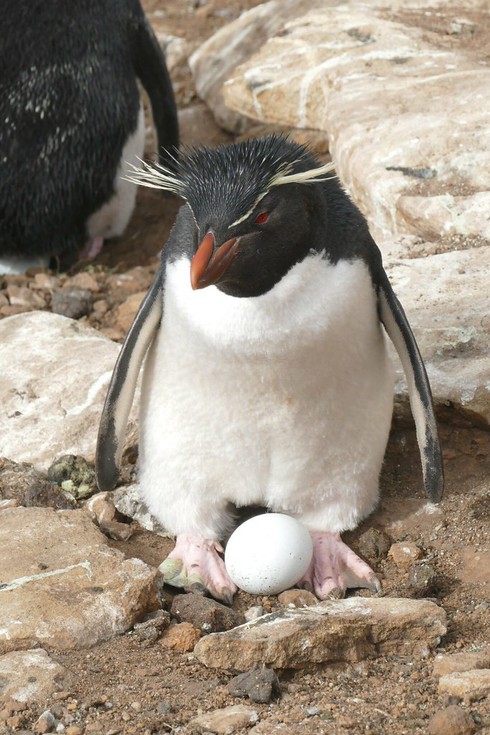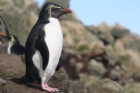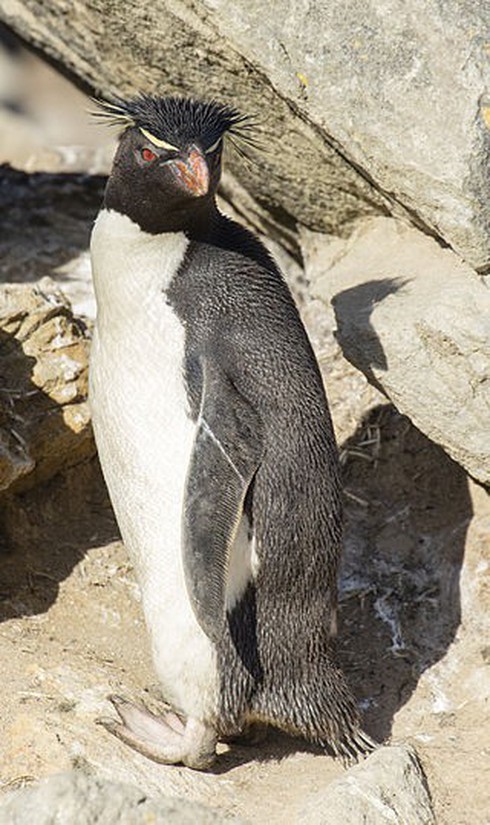 Chim cánh cụt Rockhopper đôi mắt màu đỏ, mỏ màu cam, màng chân màu hồng, và chỏm lông màu vàng, đen và nhọn trên đầu. Ảnh: khoahoc. |