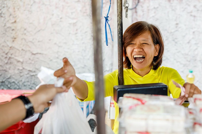 Điểm thu hút đầu tiên đối với phóng viên Mervin Lee của trang tin Saigoneer khi tới thăm khu chợ người Việt nằm giữa trung tâm Bangkok là một người phụ nữ tên Đông mặc chiếc áo dài màu vàng. |