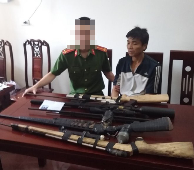 Đối tượng Nguyễn Văn Hóa (thứ 2 từ trái qua) và tang vật. |