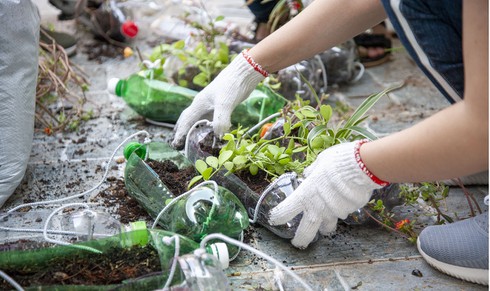 Làm vườn treo từ các chai nhựa bỏ đi. |
