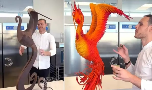 Mới đây, Amaury Guichon, một đầu bếp bánh ngọt người Pháp gốc Thụy Sĩ, khiến cư dân mạng trầm trồ khi chia sẻ hình ảnh một con phượng hoàng với loạt chi tiết sắc nét, chủ yếu làm bằng socola.