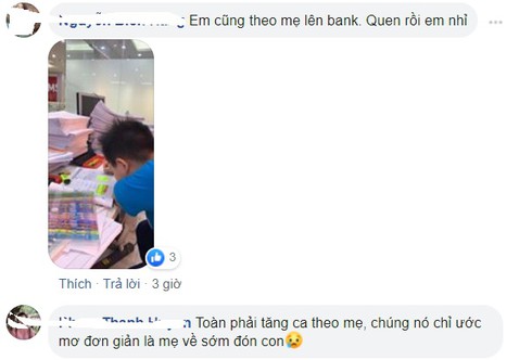 Trong khi đó, thành viên N.B.H chia sẻ hình ảnh cậu con trai đang ngồi học một mình tại nơi mẹ làm việc kèm lời bình luận: “Em cũng theo mẹ lên bank. Quen rồi em nhỉ”.