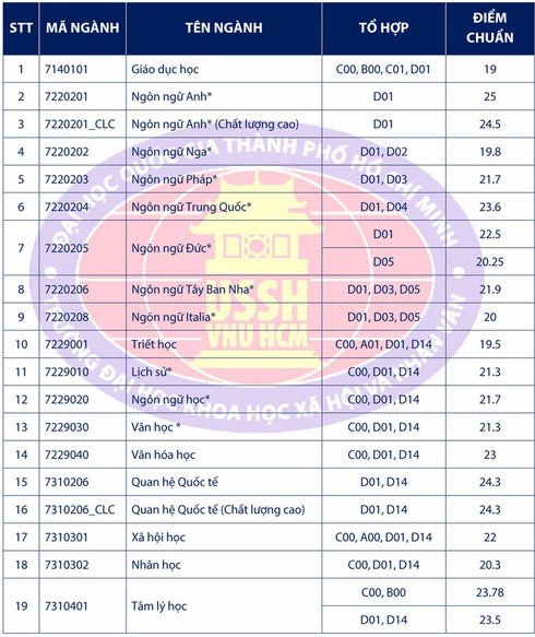 Năm nay, điểm chuẩn cao nhất thuộc về ngành Quản trị Dịch vụ du lịch và lữ hành (tổ hợp C00) với 25,5 điểm, Ngôn ngữ Anh (tổ hợp D01) với 25 điểm, Báo chí (tổ hợp C00) với 24,7 điểm, Ngôn ngữ Anh hệ chất lượng cao (tổ hợp D01) với 24,5 điểm, Quản trị Dịch vụ du lịch và lữ hành (tổ hợp D01, D14) với 24,5 điểm, ngành Truyền thông đa phương tiện (tổ hợp D01, D14, D15) với 24,3 điểm, Quan hệ quốc tế hệ đại trà và chất lượng cao (tổ hợp D01, D14) với 24,30 điểm, Báo chí hệ đại trà (tổ hợp D01, D14) với 24,1 điểm…