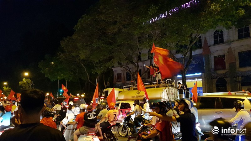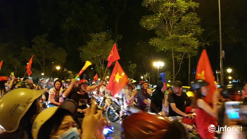 Sau tiếng còi chung cuộc, Việt Nam giành chiến thắng, trên các tuyến đường khắp TP.HCM, cờ đỏ sao vàng tung bay. Người hâm mộ trong sắc áo cờ đỏ sao vàng xuống đường mừng chiến thắng của tuyển Việt Nam trước Philippines, giành vé vào chung kết AFF CUP 2018.