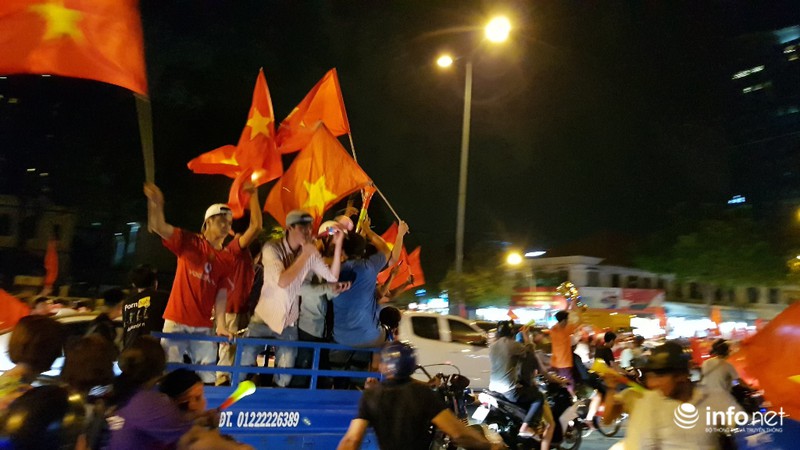 Tại các tuyến đường trung tâm TP.HCM, "biển người" nhảy múa, hò reo "Việt Nam vô địch". Người hâm mộ bắt tay, ôm nhau trong niềm vui đội tuyển Việt Nam vào chung kết AFF Cup.