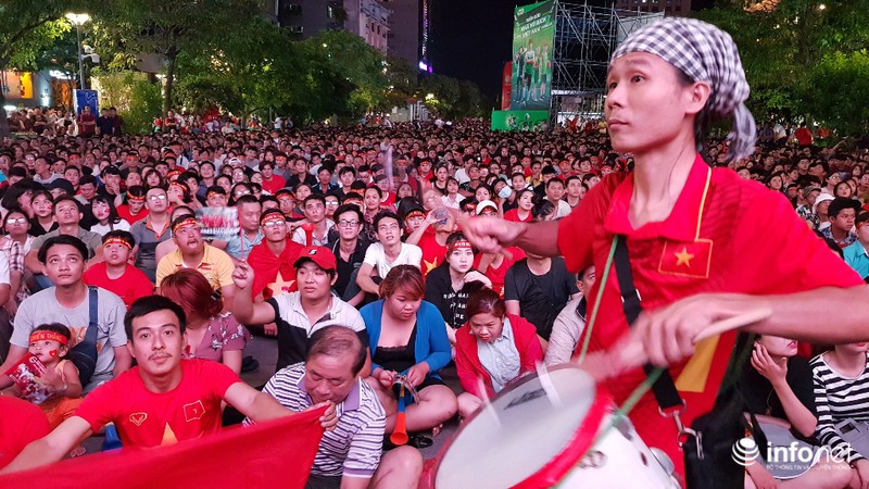 Trận đấu lượt về giữa đội tuyển Việt Nam và Philippines diễn ra vô cùng căng thẳng trong 90 phút. Hình ảnh, cổ động viên tại phố đi bộ Nguyễn Huệ căng thẳng, chăm chú theo dõi trận đấu