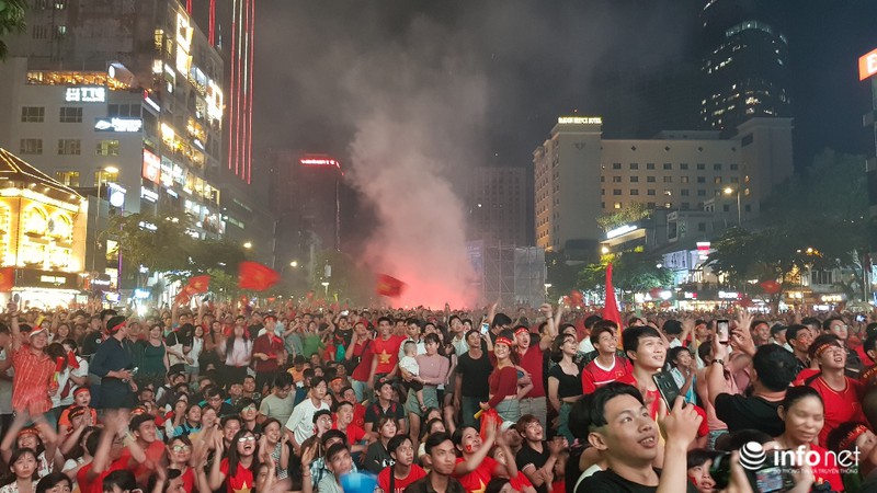 Khi đội tuyển Việt Nam ghi bàn thắng đầu tiên, người hâm mộ vui sướng ngất ngây, vỡ òa cảm xúc tại phố đi bộ Nguyễn Huệ