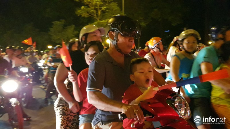Các em nhỏ cũng theo bố mẹ để phất cờ, hò reo cùng dòng người hâm mộ tại đường Lê Duẩn, quận 1. "Quá tuyệt vời. Không còn gì để diễn tả. Đội tuyển của chúng ta chắc chắn sẽ vô địch", anh Quang Thành (quận 2) đưa cả gia đình 4 người đi cổ vũ chia sẻ.