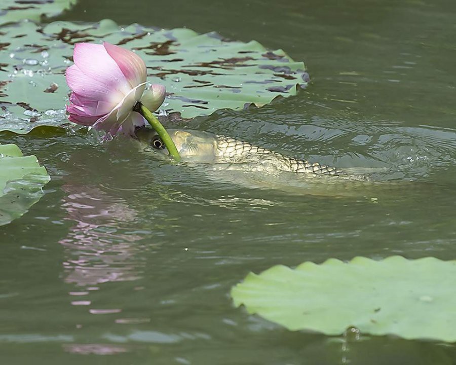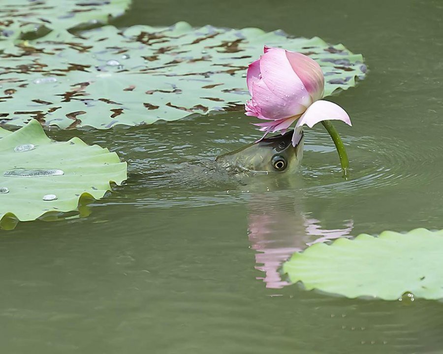 Chú cá trắm ở dưới mặt nước đã bất chợt nhảy lên và nhào đến một bông hoa Sen, cắn thẳng vào cánh hoa, giật đứt từng cánh và cho vào mồm.