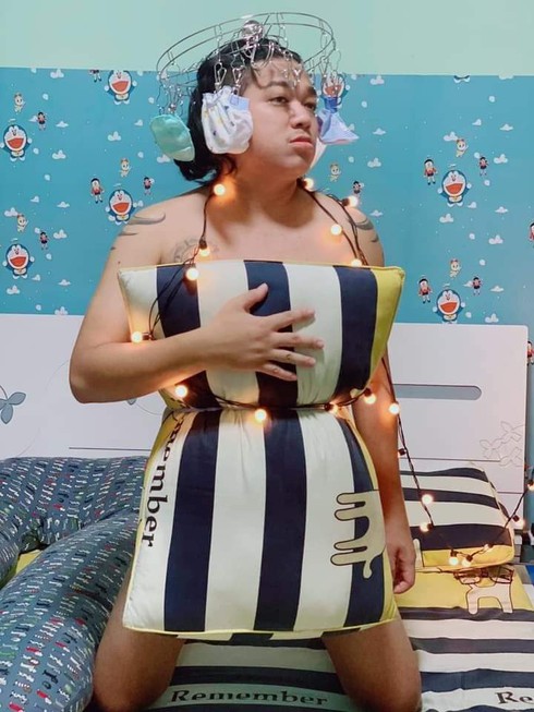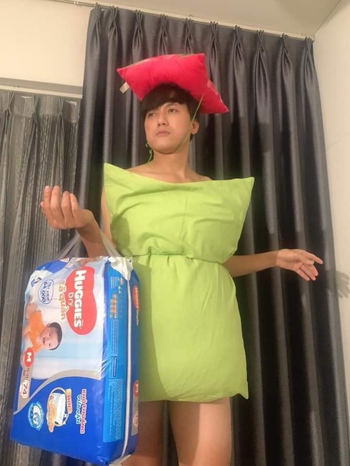Đến lượt nam diễn viên Quách Ngọc Tuyên "bắt trend" cũng là một phen "mếu máo" không kém. Phối cùng chiếc gối màu xanh non là chiếc "nón" màu đỏ chói cùng túi tã giấy của trẻ sơ sinh trên tay. Nhiều người trêu chọc Quách Ngọc Tuyên khi chỉ mới nghỉ ở nhà tránh dịch có nửa tháng đã ra dáng vẻ này.