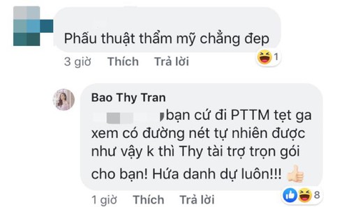 Ngay sau khi bức hình được chia sẻ, nhiều người hâm mộ đã không tiếc lời khen dành cho cô. Thế nhưng cũng có anti-fan vào tố cô phẫu thuật thẩm mỹ thì mới được khuôn mặt như vậy chứ làm gì có chuyện mộc mạc ở đây. Thay vì tỏ ra phẫn nộ, Bảo Thy lại có màn đáp trả khiến ai cũng phải nể phục.