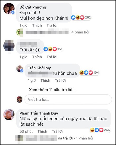 Ngay lập tức nghệ sĩ Cát Phượng phải dành lời khen ngợi: "Đẹp đỉnh! Múi con đẹp hơn múi Khánh", đến bạn thân Thanh Duy cũng phải ngỡ ngàng: "Nữ ca sỹ tuổi teen của ngày xưa đã lột xác lột sạch hết!".