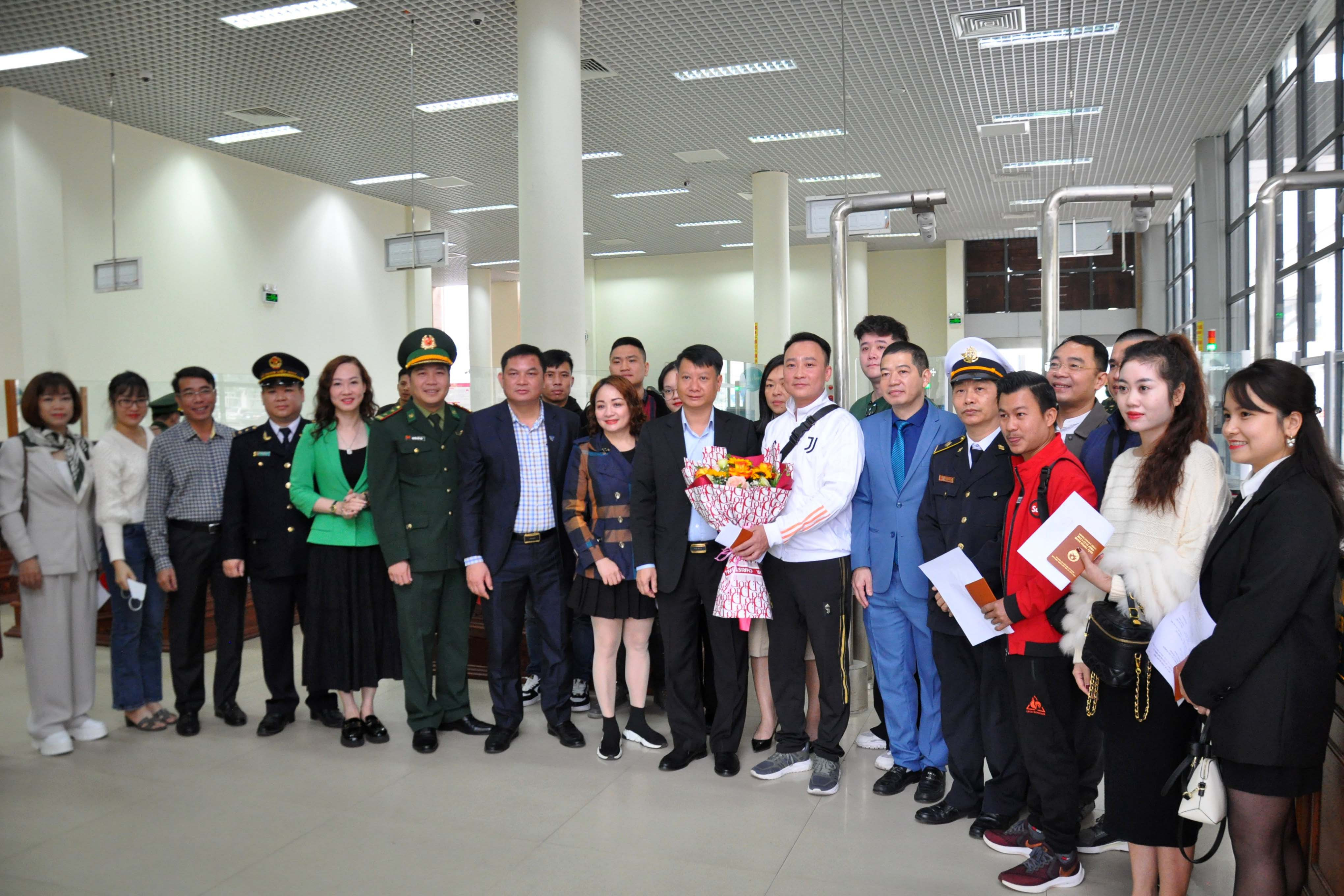 Lãnh đạo TP Móng Cái đã có mặt tại cửa khẩu để tặng hoa, chúc mừng những người đầu tiên xuất, nhập cảnh qua cặp cửa khẩu này sau thời gian 3 năm tạm dừng do ảnh hưởng của dịch Covid-19.