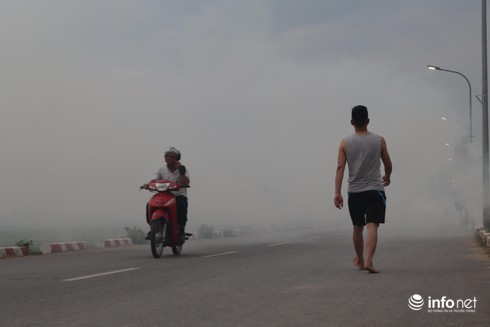 Khói âm ỉ tỏa ra khắp nơi, làm ảnh hưởng tới việc tham gia giao thông của người đi đường. |
