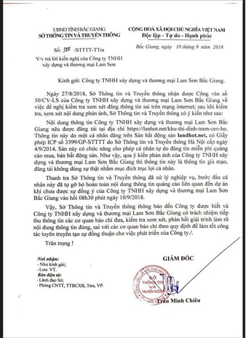Cụ thể, văn bản số 588/STTTT-Ttra của Sở Thông tin và Truyền thông ngày 10/9 nêu rõ: Ngày 27/8/2018, Sở Thông tin và Truyền thông nhận được công văn số 50/CV-LS của công ty TNHH xây dựng và thương mại Lam Sơn Bắc Giang về việc đề nghị kiểm tra xem xét đăng thông tin sai trên mạng Internet; Sau khi kiểm tra, xem xét nội dung phản ánh, Sở Thông tin và Truyền thông có ý kiến như sau: