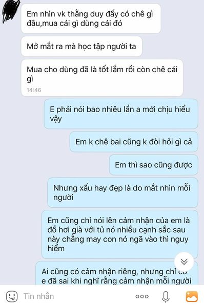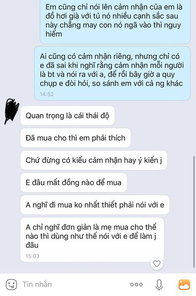 Em mới bày tỏ suy nghĩ với chồng 1 cách rất bình thường như vậy nhưng liền bị anh ấy nói rằng em đòi hỏi, có người mua cho dùng đã là tốt rồi. Chồng còn so sánh em với người khác là vợ thằng A mua gì nó cũng đồng ý chứ không ý kiến như em. Em giải thích với chồng rất nhiều là em không chê bai gì đồ mẹ mua, cũng không nói nó xấu, chỉ là theo cảm quan em thấy thiết kế này già.