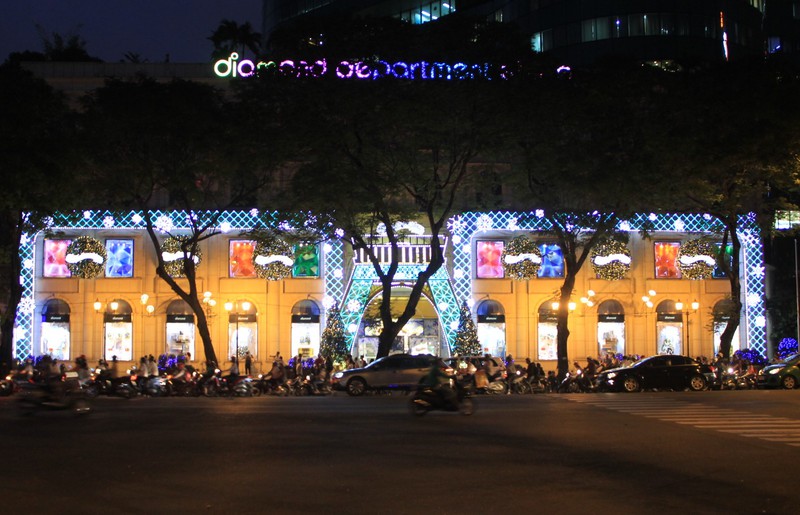 Tiết trời TP.HCM vừa trở lạnh, nhiều cửa hàng, trung tâm thương mại, khách sạn đã được trang hoàng lộng lẫy, lung linh đèn hoa. Cây thông Noel được trang trí những cặp chuông, dây giả tuyết, những chiếc ủng, đôi vớ, các hộp quà tượng trưng...