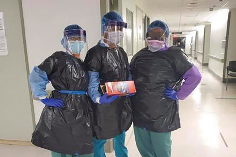 Các nhân viên y tế tại bệnh việnMount Sinai làm đồ bảo hộ từ túi đựng rác. (Ảnh: Twitter) |