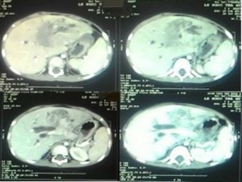 Bệnh nhi được đưa đến BV Nhi Đồng 2 trong tình trạng vàng da kéo dài tăng dần khoảng 2 tháng và đi cầu phân trắng. Sau khi chụp CT scan vùng bụng, các BS đã phát hiện một khối u gan rất lớn, chiếm hết toàn bộ gan trái, gây ra tình trạng vàng da tắc mật bất thường của bé.