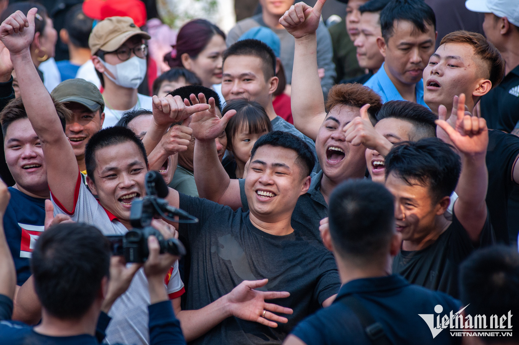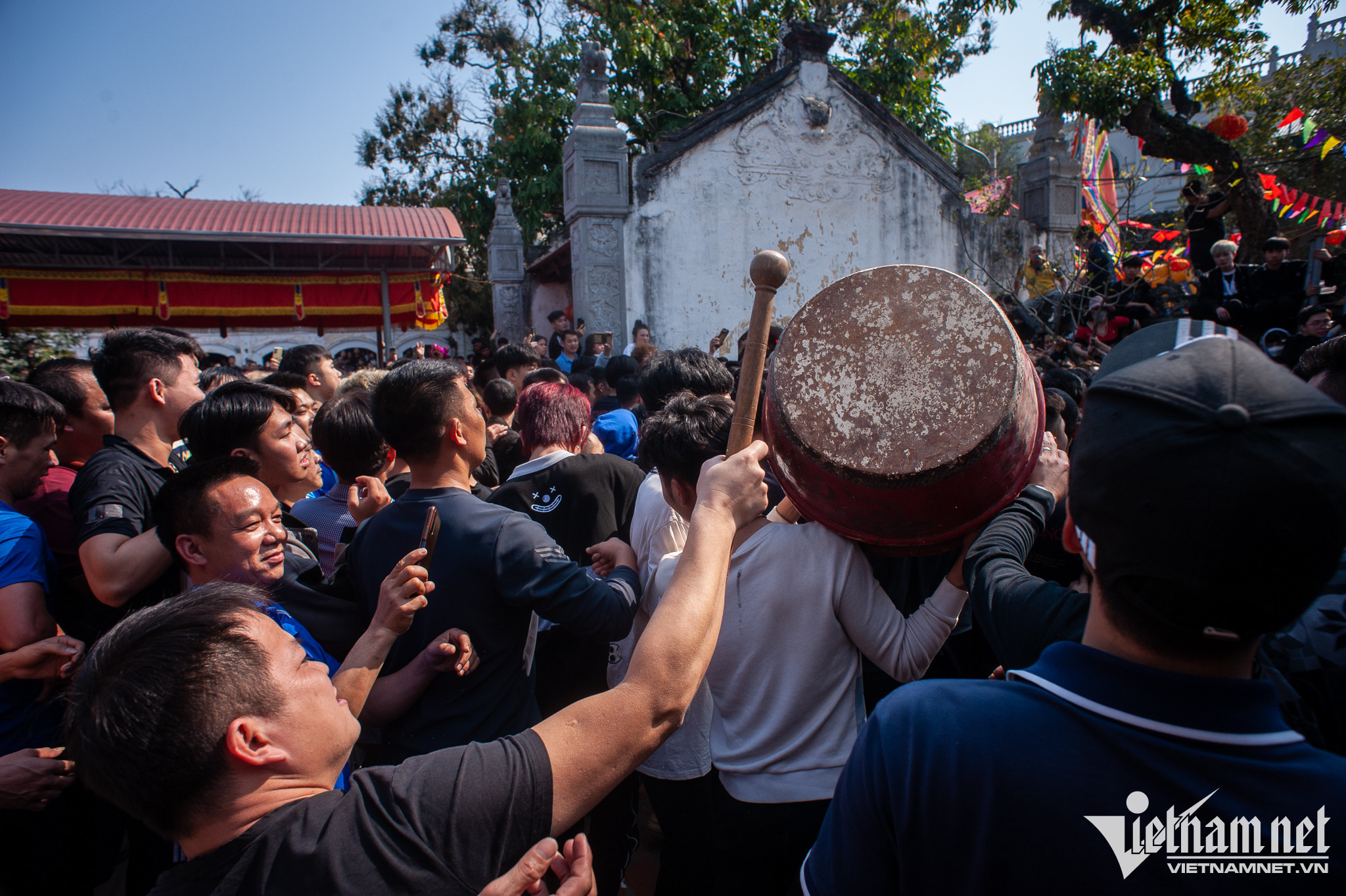 Những người đứng vòng ngoài hò reo, đánh trống nhằm khích lệ và cổ vũ tinh thần các trai tráng chơi hội.