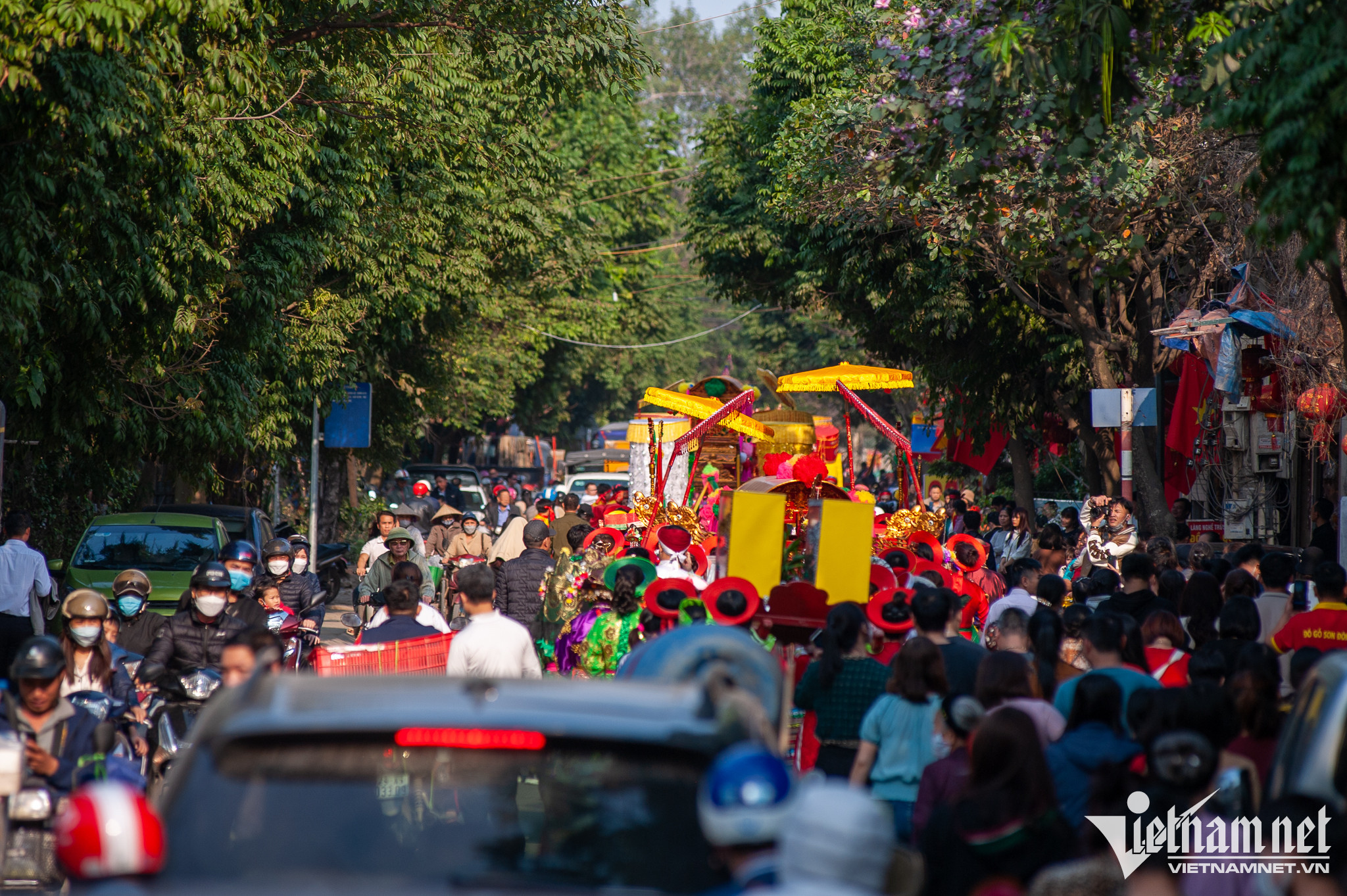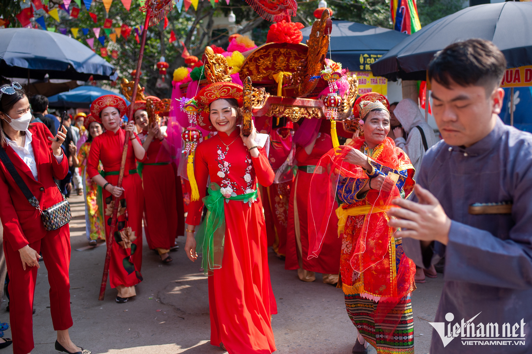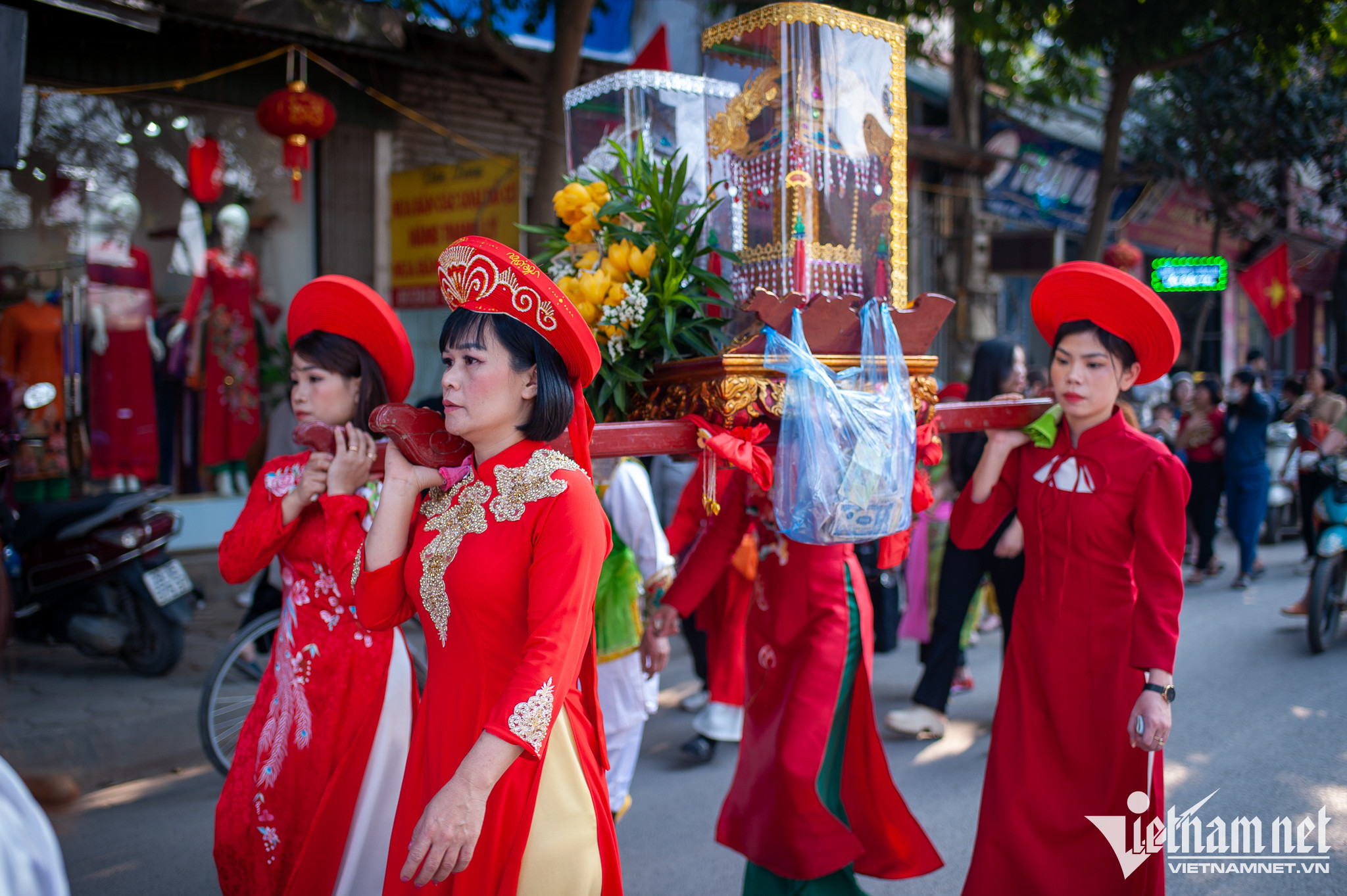 Diễn ra song song cùng hội giằng bông còn nhiều chương trình khác. Trong ảnh, người dân làng Sơn Đồng thực hiện lễ rước đức thánh mẫu. Theo tục xưa thì đám rước mẫu từ chùa Kỳ Đà lên chùa Diên Phúc được tiến hành đồng thời với việc rước kiệu lễ và tế lễ tại đình làng.