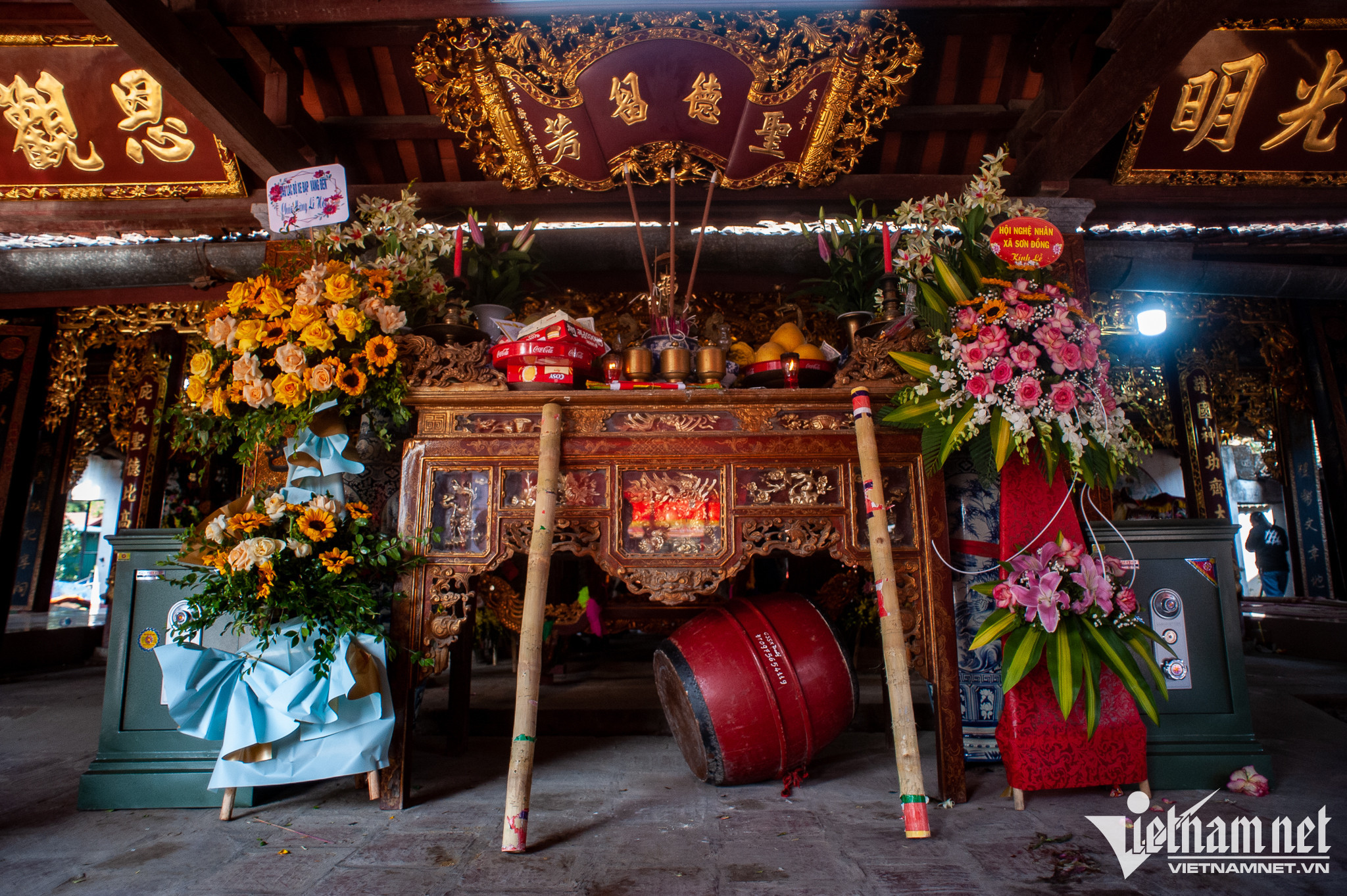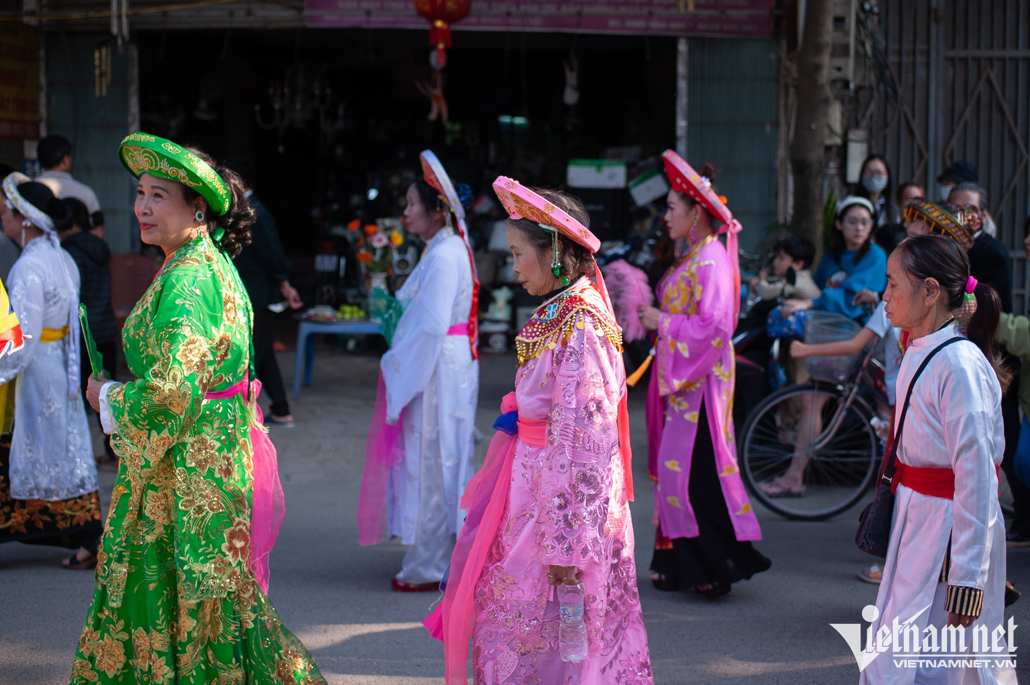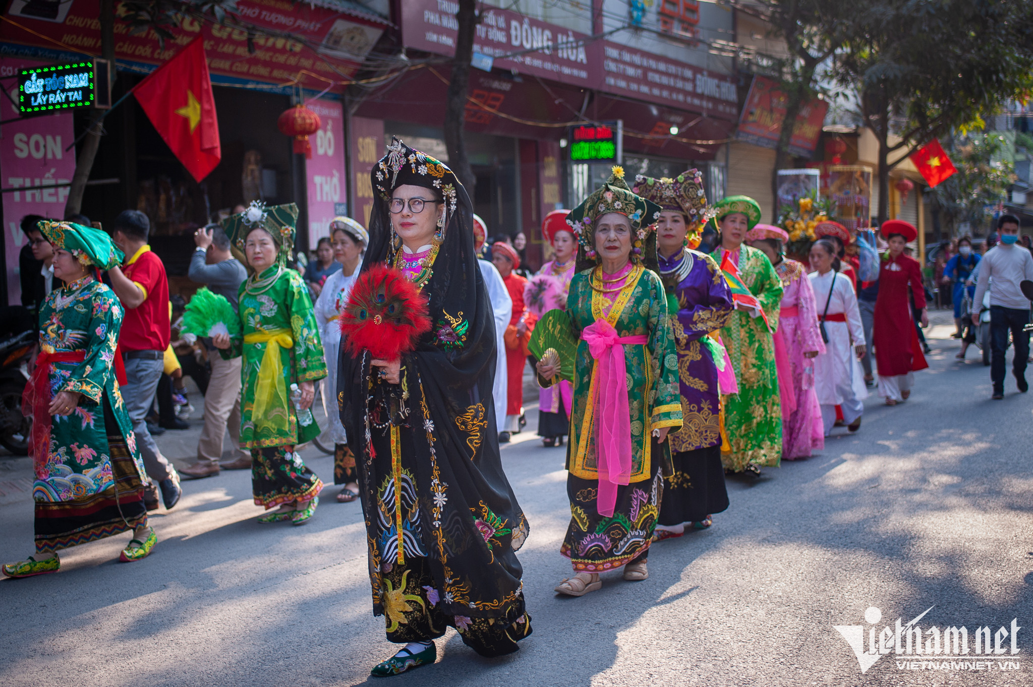 Diễn ra song song cùng hội giằng bông còn nhiều chương trình khác. Trong ảnh, người dân làng Sơn Đồng thực hiện lễ rước đức thánh mẫu. Theo tục xưa thì đám rước mẫu từ chùa Kỳ Đà lên chùa Diên Phúc được tiến hành đồng thời với việc rước kiệu lễ và tế lễ tại đình làng.