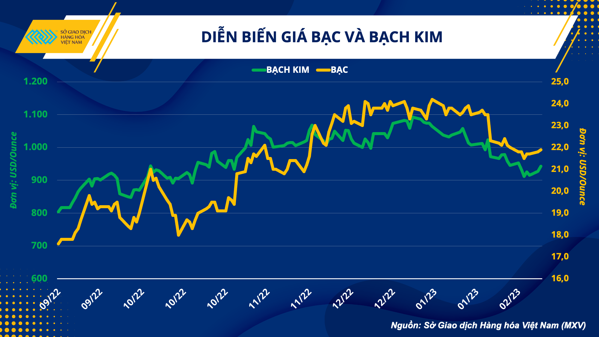 Theo Sở Giao dịch Hàng hoá Việt Nam (MXV), kể từ đầu năm đến nay, giá bạc đã đánh mất khoảng 12% giá trị và trở về mức thấp nhất kể từ tháng 11 năm ngoái. Trong khi đó, bạch kim ghi nhận đà lao dốc mạnh mẽ hơn khi giảm gần 18% so với mức đỉnh hồi đầu tháng 1 năm nay. Đóng cửa phiên giao dịch ngày 21/2, giá bạc đạt mức 21,89 USD/ounce, giá bạch kim được giao dịch thấp hơn 950 USD/ounce.