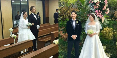 Song Hye Kyo - Song Joong Ki và Kim Tae Hee - Bi Rain tương đồng về độ nổi tiếng, ngoại hình xinh đẹp, nhưng lễ cưới hai cặp đôi là tông màu đối lập.