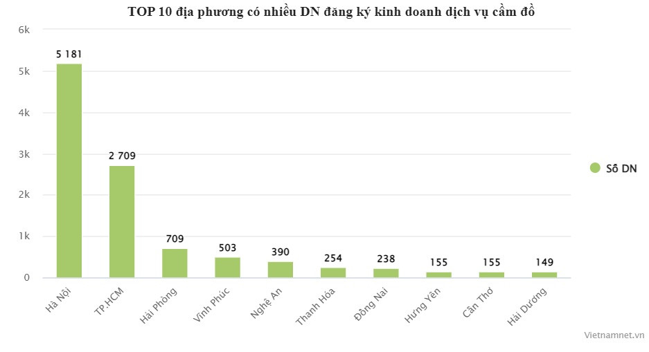 Số lượng doanh nghiệp có kinh doanh cầm đồ ở Hà Nội cao gấp đôi địa phương xếp thứ hai là TP. Hồ Chí Minh, gấp hơn 7 lần địa phương xếp thứ ba là Hải Phòng, gấp 10 lần địa phương xếp thứ 4 là Vĩnh Phúc.