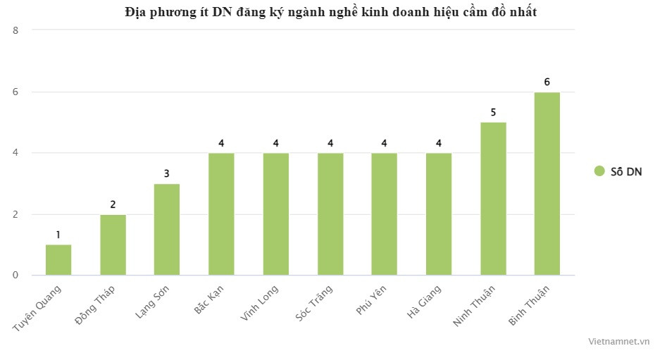 Ngoài Trà Vinh không có doanh nghiệp nào đăng ký kinh doanh dịch vụ cầm đồ, thì nhiều tỉnh thành khác cũng chỉ có từ 1-5 doanh nghiệp đăng ký ngành nghề này.