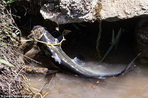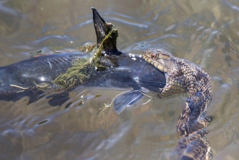 Kinh ngạc rắn nước vật lộn nuốt chửng cá trê "khủng"