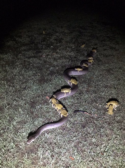 Paul Mock người dân địa phương cho biết khoảng 10 con cóc mía cưỡi trên lưng một con trăn dài 3,5 mét để chạy trốn nước lũ. Paul Mock đã may mắn ghi lại khung cảnh ấn tượng này.