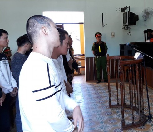 Bị cáo Hùng và đồng bọn trong phiên tòa. |