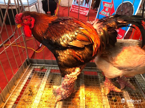 Tại hội chợ ở Hoàng Quốc Việt (Cầu Giấy, Hà Nội), Chủ HTX Chăn nuôi và Kinh doanh gà Đông Tảo (Hưng Yên) đang rao bán con gà Đông Tảo có cặp chân khủng, xù xì với giá 10 triệu đồng.