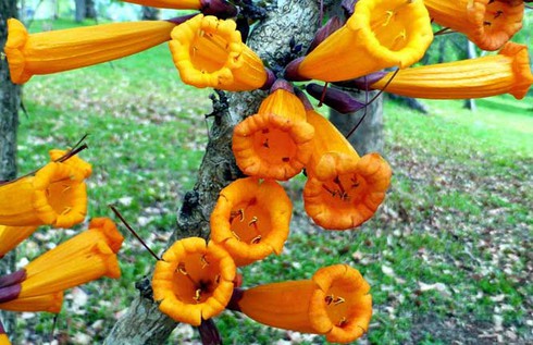 Cây rà đẹt lửa có tên khoa học là Radermachera ignea. Đây là loài thực vật biểu tượng của tỉnh Chiang Rai, Thái Lan. Cây có hoa mọc từ thân vô cùng kỳ lạ. Cây rà đẹt lửa còn có tên gọi khác là cây đại khải hay rà đẹt đền Hùng. Đây là cây thân gỗ có hoa màu vàng cam mọc trực tiếp từ thân cây.