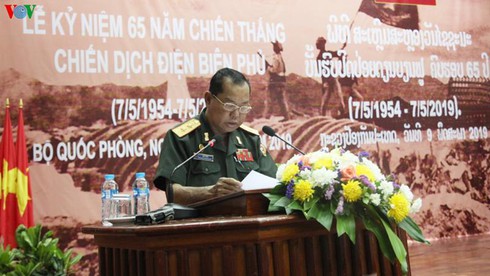 Thứ trưởng Bộ Quốc phòng Lào, Trung tướng Phuvong Vongphom đọc diễn văn ôn lại mốc son chói lọi của Quân đội và nhân dân Việt Nam trong cuộc kháng chiến chống thực dân Pháp xâm lược, làm nên chiến thắng Điện Biên Phủ lừng lẫy 5 châu chấn động địa cầu 65 năm trước, góp phần thúc đẩy mạnh mẽ phong trào đấu tranh vì mục tiêu độc lập dân tộc, hòa bình, dân chủ và tiến bộ xã hội ở 3 nước Đông Dương và trên thế giới.