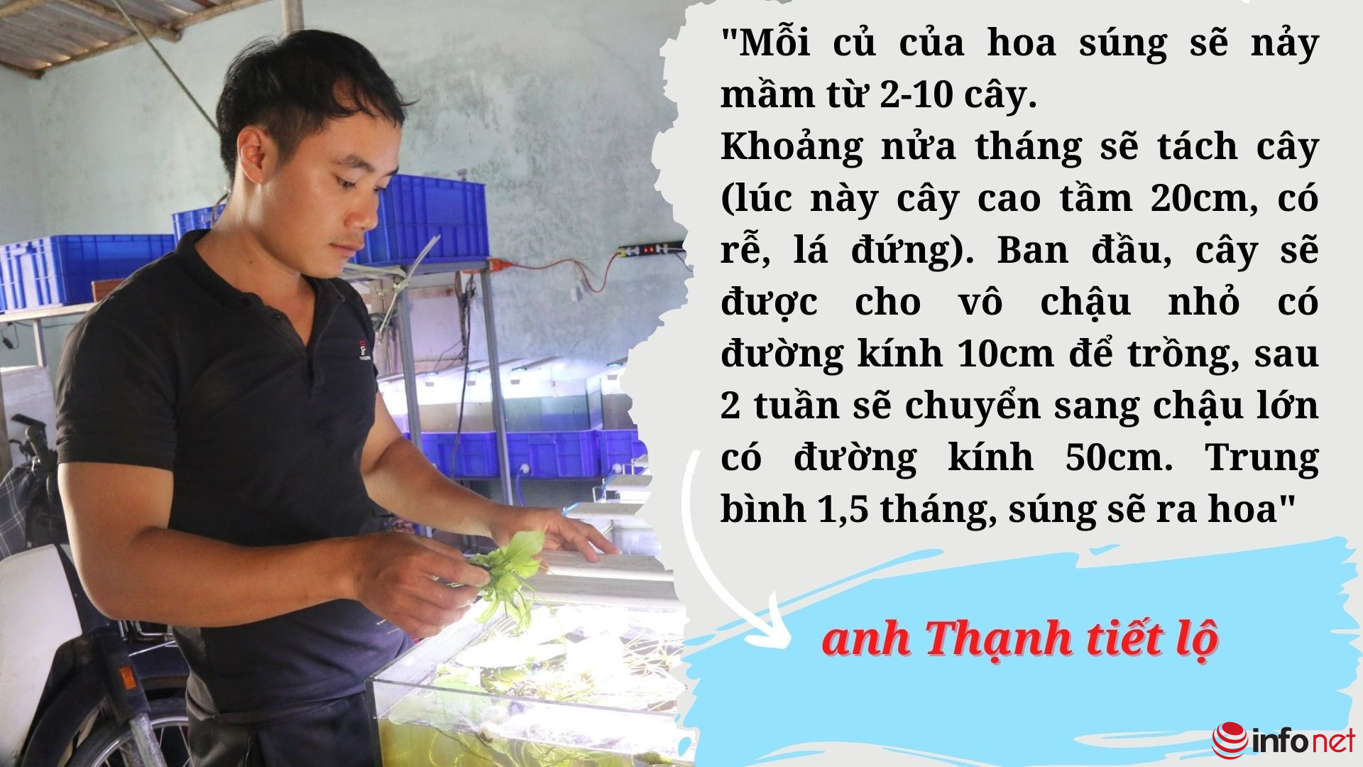 Chàng kỹ sư cho biết, mỗi củ của hoa súng sẽ nảy mầm từ 2-10 cây. Khoảng nửa tháng sẽ tách cây (lúc này cây cao tầm 20cm, có rễ, lá đứng). Ban đầu, cây sẽ được cho vô chậu nhỏ có đường kính 10cm để trồng, sau 2 tuần sẽ chuyển sang chậu lớn có đường kính 50cm. Trung bình 1,5 tháng, súng sẽ ra hoa.