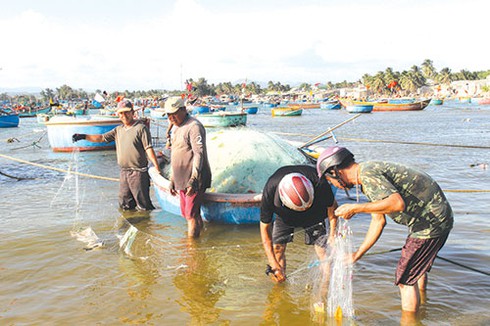 Đứng trên bờ kè bãi biển La Gàn, ánh mắt của một lão ngư luôn dõi theo con sóng biển để tìm luồng cá đối. Chỉ vào luồng nước biển màu xanh đen đang chuyển động, ông hét lên “cá kìa, cá kìa…”.