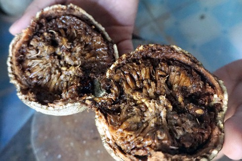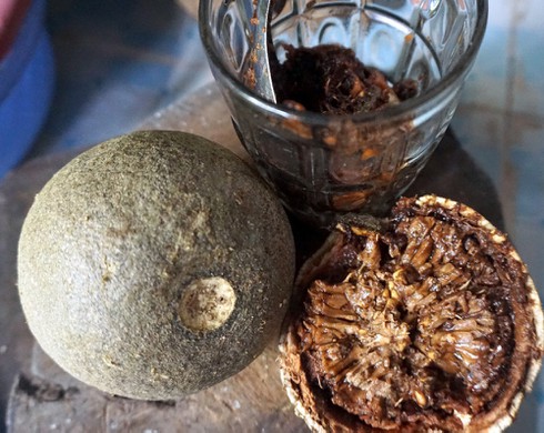 Bên trong lớp vỏ cứng, xù xì là ruột trái quách đặc sệt, có màu đen hoặc tím trông… không mấy hấp dẫn. Thế nhưng nó lại có mùi vị hấp dẫn lạ kỳ. Ruột trái quách là vô số những hạt nhỏ ngọt lịm, thơm lừng. Từ lạ lẫm, người ăn quách bị “ghiền” lúc nào không hay! |